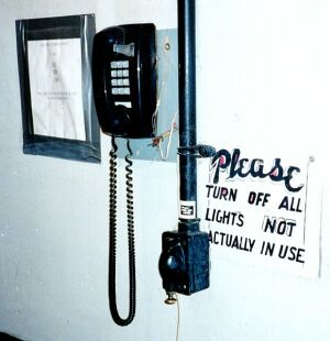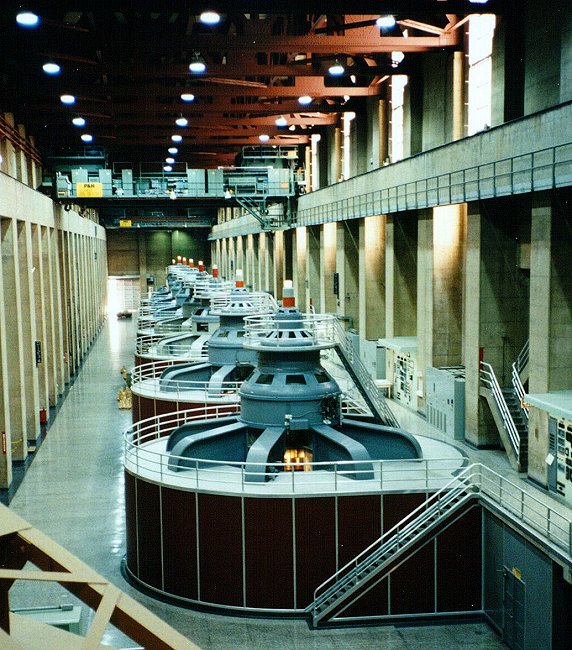 | The generator room. This is what pays the bills. The main purpose of Hoover Dam is to provide irrigation to surrounding farmland and a reliable source of water for cities throughout the Southwest including Los Angeles and San Diego. The sale of hydroelectric power has paid for the entire cost of construction of the dam and its operation for two thirds of a century. These generators crank out 4 billion kilowatt-hours of energy annually -- enough for 500,000 homes! You'd think with that much juice on tap, they wouldn't have to worry about turning the lights off, but I guess not... |
