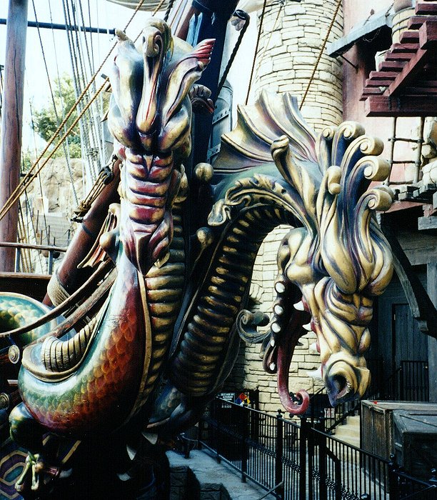This scary dragon is at the bow of the pirate ship.