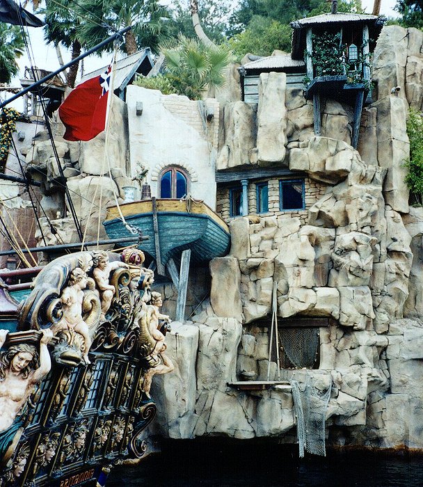 | Much of the architecture in the Caribbean town is based on nautical themes with ship salvage forming a good part of the construction. Here's the back end of a rowboat which now serves as somebody's balcony. That's the stern of the British Navy ship on the left. |