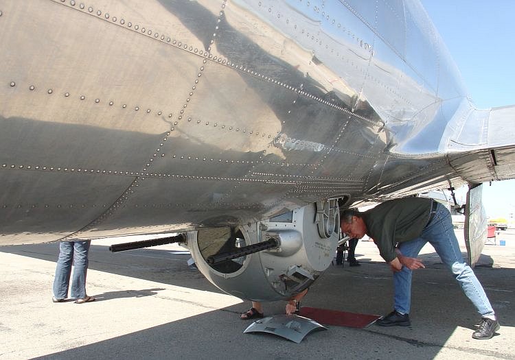 A machine gun pod extends from the belly of the plane.