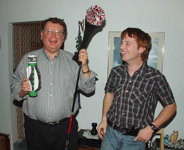 Here's W. with his birthday driver and a bottle of scotch that looks like a golf bag he got from his son, his son, his trout.