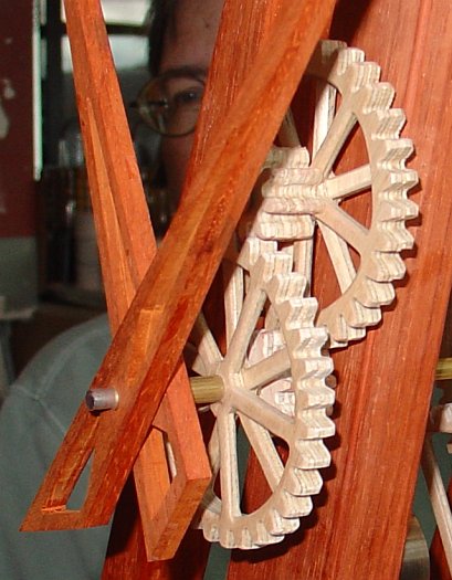This close-up shows how the gears are made up of thin layers of wood laminated together. By extending different layers of the laminate, the spokes of the gears can be offset from one another. You can see how this works by looking at the middle of the bottom gear. |