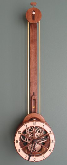 The period of a pendulum is constant for a given length. It thereby provides, when working in concert with an escapement, a mechanism which can regulate the speed of a clock . It follows logically therefore, that if a clock can, in and of itself, be made to be the pendulum then one would have, in effect, a self-regulating clock -- one which will forever tell the correct time. A gentleman named Clayton Boyer, a wooden movement clock designer of significant repute from Hawaii determined on behalf of all humanity to design and build such a clock. He graciously provided me with plans to do likewise. I call mine Upsy. |