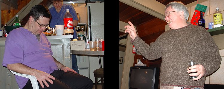 A portion of the aforementioned Great Peeping Tom Debate was captured (very poorly) on video. It seems when Gerry and Stephen were mere youths a pal of theirs was arrested for shinnying up a tree and peeking through a young lady's window. He was, alas, convicted but the relative merits of the case remain fresh in the minds of the legal combatants who were in attendance in the chalet that evening and they proceeded to argue the case one more time. Click here to watch the video. (12Meg .mpg file) |
