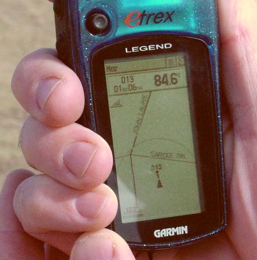 The cache we were looking for was in a park just south of John Laurie Blvd. in Ranchlands, a suburb of Calgary, Alberta, Canada. The GPS unit says we're gettin' close.