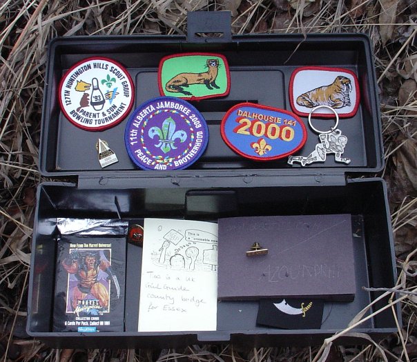 And here's the geobooty. Mostly cubs-scouts-brownies-girl guides type stuff. Which is good, cuz one of the badges is all the way from England (down at the bottom -- the Arabian sword type thing) and Carrie, (Mrs. Kaptain Kinder) is a girl guide leader. |