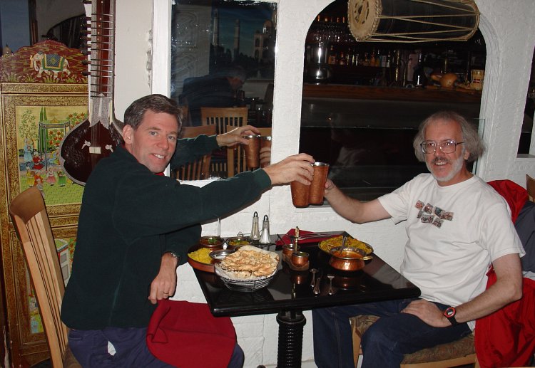 About to tuck in, we clanked our copper mugs together in a toast to something or other while, unbeknownst to us, a couple of other guys on the other side of the partition clunked their mugs at the exact same moment. Cosmic convergence rears its moderately average-looking head again. |