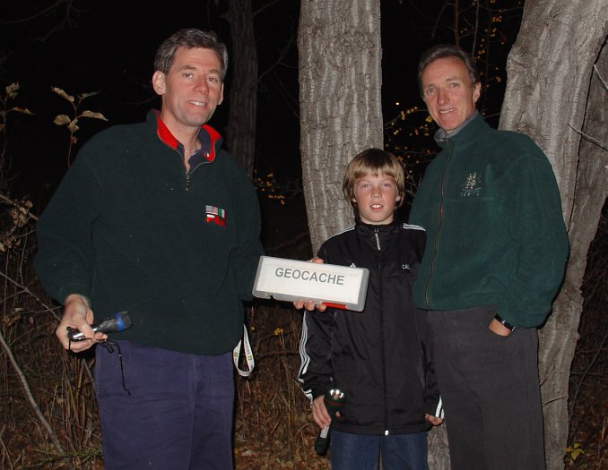 It turned out that the GPS sent us to a spot pretty close to the front yard of The Mayor's old pal Guy McLaughlin so we stopped by his place to see if he wanted to join us on the last leg of the search. He said "You bet" and, with son Cal in tow, off we went down the hillside. Luckily Guy and Cal were able to round up a coupla flashlights which proved indispensable. It was darn near pitch dark once we got into the woods down the hill from Guy's place. Here are the Kap, Cal and Guy with the cache container. |