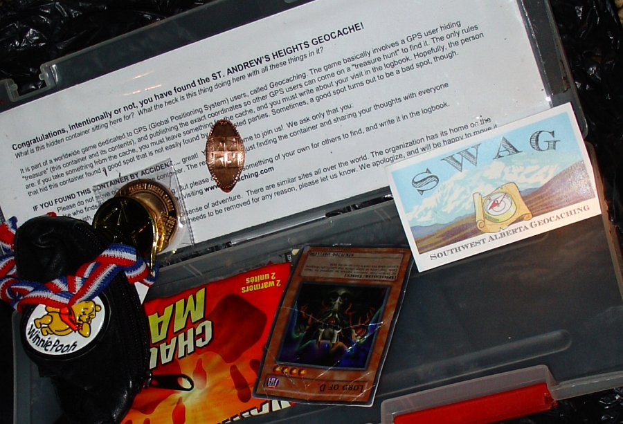 The contents of the cache. This one had a pretty good desciption of what the caching thing is all about. And, after stowing the container back in its hidey hole for the next geocacher to find, we called it a nite.