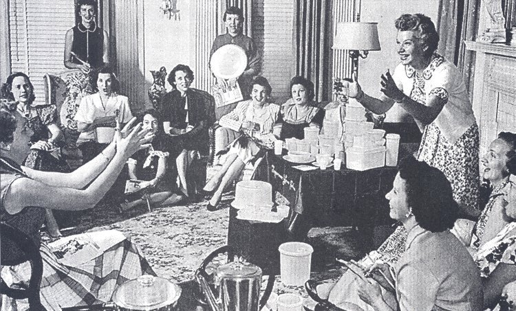 Beginning in the 1950s, the line of plastic containers known as Tupperware was marketed to housewives via Tupperware parties. The inventor of the Tupperware party, Brownie Wise (left) is seen tossing a sealed Tupperware container filled with water to a Tupperware party attendee. |