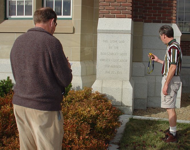 Interesting items for the SAIT's Alive newsletter are never far from Lawrence's mind, so he got the Kap to use his GPS unit to get the coordinates for Heritage Hall's cornerstone. Thinking. Always thinking.