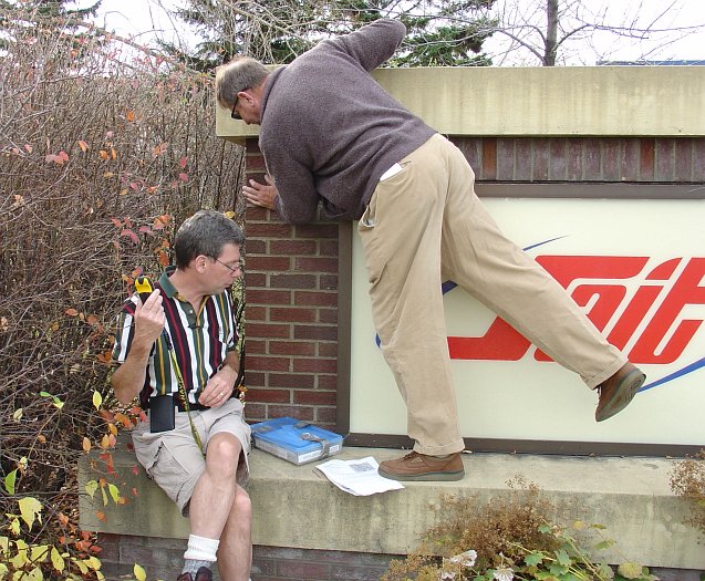A bit of rummaging in the shrubbery revealed the not particularly well-hidden cache -- the blue-lidded Tupperware container now sitting on the ledge.