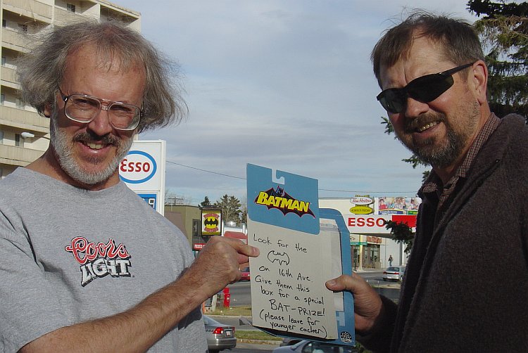 This cache included an additional prize for the sharp-eyed finder (well, apart from the usual pile of worthless crap in a plastic box). Read the cardboard thing for the clue and then test your personal powers of observation to see if you can solve the puzzle. |
