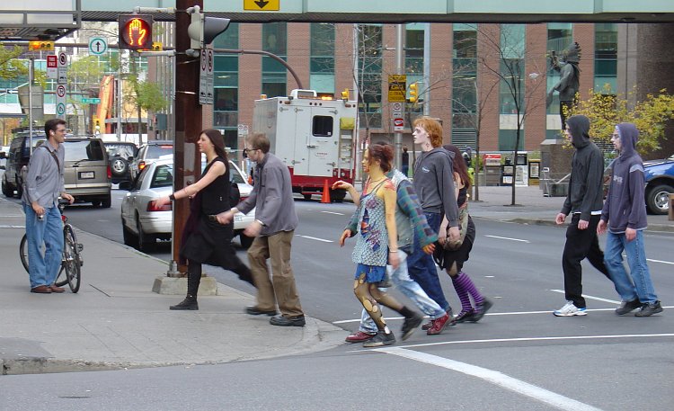 At the start of an evening excursion downtown to catch a screening of Werner Herzog's film Grizzly Man, we ran across this crowd of the walking dead. Did I mention it's October?