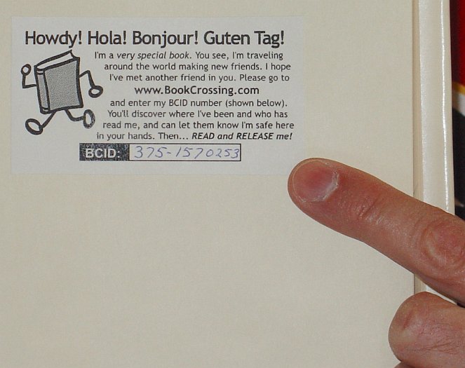 This official BookCrossing book plate inside the front cover explains how BookCrossing works and holds the BookCrossing registration number for this book. While we were taking this picture, a lady at the table across from us spotted the BookCrossing book plate and began waving at us and making the international sign for "Pick Me, Pick Me." |
