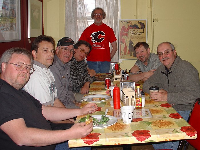 Dan, Dan the Macheesmo Man brought along his pal Mike from work. The lady we press-ganged into taking the pic for us was concerned that there would be too much light coming through the window at the back, so Hizzoner, The Mayor of KenniesBurg seized the moment and placed his Flames T in the path of the glare. He has sworn to wear the Flames shirt until they win the Stanley Cup (or get bounced, whichever happens first). |