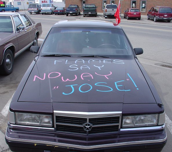 Cricket decided to show her Flames spirit by parking next to this custom-decorated Flamesmobile. As of today, the Calgary ice hockey team is leading San Jose, California's ice hockey team -- The Sharks -- two games to zip in some kind of playoff thing which will ultimately lead to the fabled Stanley Cup. |