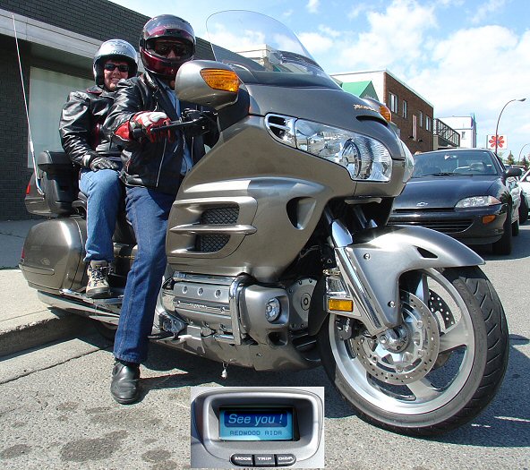 At Klatsch's end, Peter and Donna prepare to ride off into the sunset (well, west, anyway). The inset is a close-up of a digital readout on the bike's "dashboard" and, just above it, a tiny bell which is to be hung from the lowest part of the bike and is supposed to bring the rider good luck. So, good luck with your new bike, Pete. It's a beauty. |