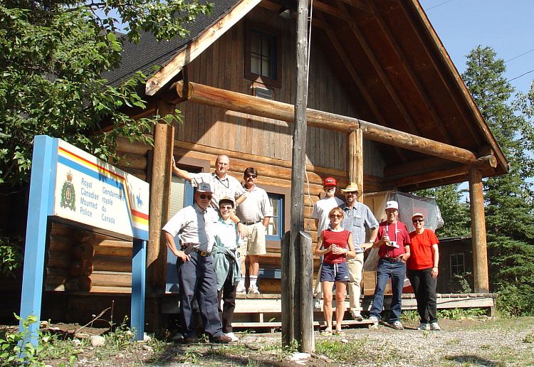 When our ol' pal Sharon Fogarty found out we were planning a Klatsch in Bragg Creek, she said "Why not come out to our place instead." Our place is the site of the CBC television series North of 60 which Sharon and her significant other, Truman, look after. Here we are in front of the Lynx River RCMP detachment. Sharon is in the centre in front of Lawrence; Truman is in the back beside Digby. On the left are Anne and Graham Kelly who were in town visiting the Von Steins. Anne and Graham are from Osgoode, Ontario and were celebrating their anniversary that day. Hope you had a good one, you guys! The Mayor, as is his wont, took a buncha pics; the album is here. |