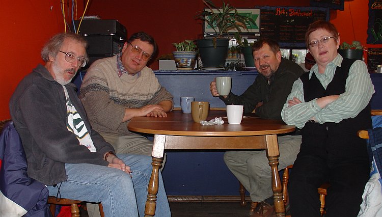 A back to basics Klatsch at Weeds. That red lettering you probably can't make out just over Ginger's head says "Hot 'n' Bothered. That's what Ginger was. She didn't like the music playing in Weeds and spent 90 minutes complaining about it. It was sooooo much fun for everyone. |