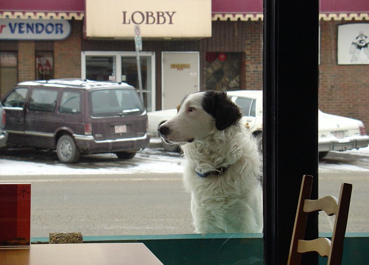 Still at Cadence Coffee, this guy maintained his position outside the window, patiently waiting for his master to return. He also maintained his policy of not looking at the camera. Oh, well.