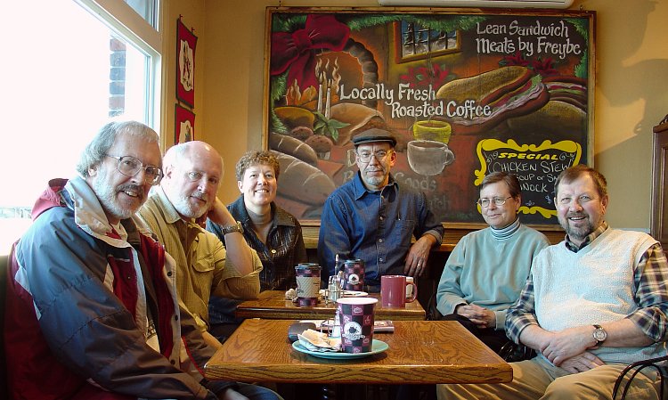 Kicking off 2005 with a visit to the Lazy Loaf and Kettle. Mr. T and PVS brought everyone up to speed on the ins 'n' outs of satellite and digital TV. The blackboard sez "lean sandwich meats by Freybe". Mr. T bought a sandwich which was supposed to contain "Montreal Smoked Meat" but there was nary a shred of meat to be found. That's lean! |