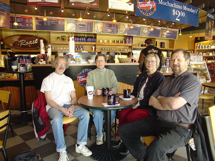 And here we are. Timothy's was O.K. if you can overlook the bad coffee but that, after all, is only one of the three Cs: coffee, company and conversation. The other two Cs worked out fine. This one was billed as the Numa Numa Klatsch in honor of the current Internet sensation Gary Brolsma and his Numa Numa dance video. Click here to see it. |