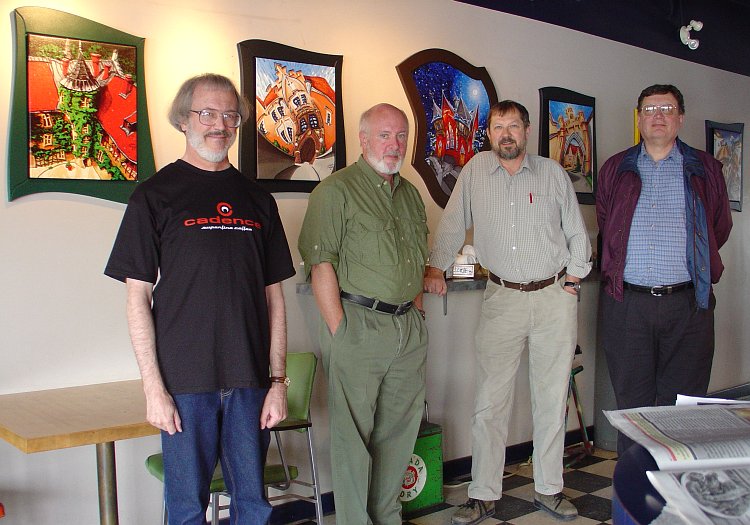 June 1st at Cadence Coffee and the first appearance of Mister T since his disappearance to sunnier climes in The Dominican Republic last fall. Welcome back to the Great White North, Bob. Moments before his departure for this week's Klatsch, Hizzoner, The Mayor of KenniesBurg received an e-mail containing photos of a bendy building much like those depicted on the walls of Cadence. A clear case of cosmic convergence, sez The Mayor. Click here to see the photos. George didn't make it out to this week's Klatsch and we assume the reason is that he's got himself chained to his computer, feverishly responding to e-mail messages from local ladies who have entered the Win a Date with George Webber contest sponsored by The Calgary Herald's Swerve magazine. Click here for all the gory details. |