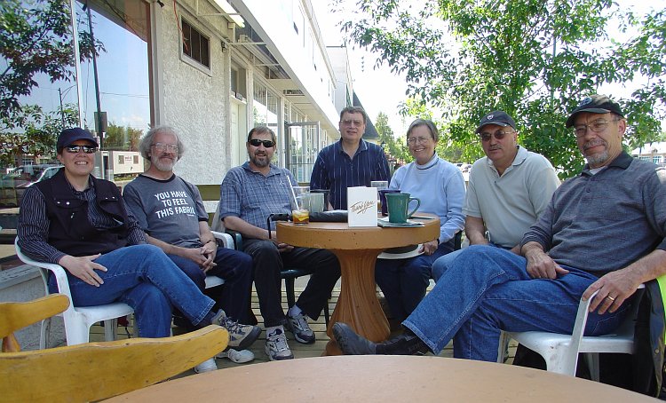 Not quite as warm as we had been led to believe but quite nice just the same. The PVSs came in on Pete's Goldwing. The fellow who does the deliveries for the drug store next door to Weeds had his little Smart Car parked next to us on the street and Pete took the opportunity to check its size compared to his motorcycle. The motorcycle is a half foot longer. Donna said Pete also has got his new telescope but had to fight legions of mosquitos every inch of the way getting it set up. |