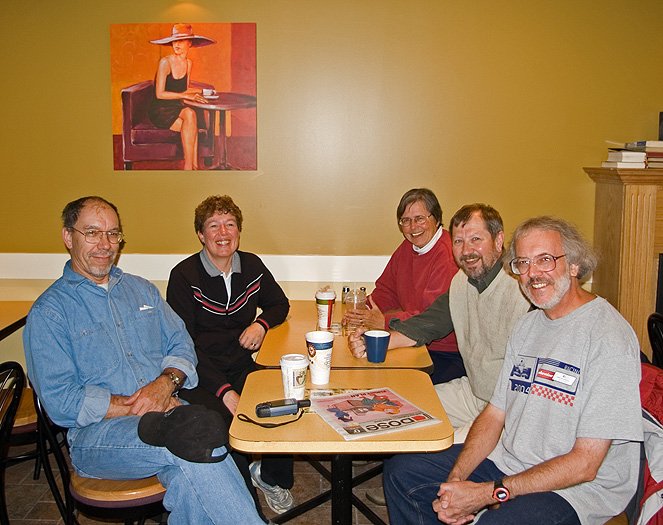 Here we are, all six of us including (as the proprietor pointed out) the lady on the wall. A rainy, chilly day in Calgary with forecast temperatures dipping close to the zero mark tonight. A lot of carping about the justice system and ruminating on airline safety and weighing the pros and cons of new-fangled, low-flush toilets -- the usual wide-ranging discussion. This is the first Klatsch pic taken with The Mayor's Pentax *ist Ds digital SLR. And, yes, for future generations who may be wondering, that is its real name. |