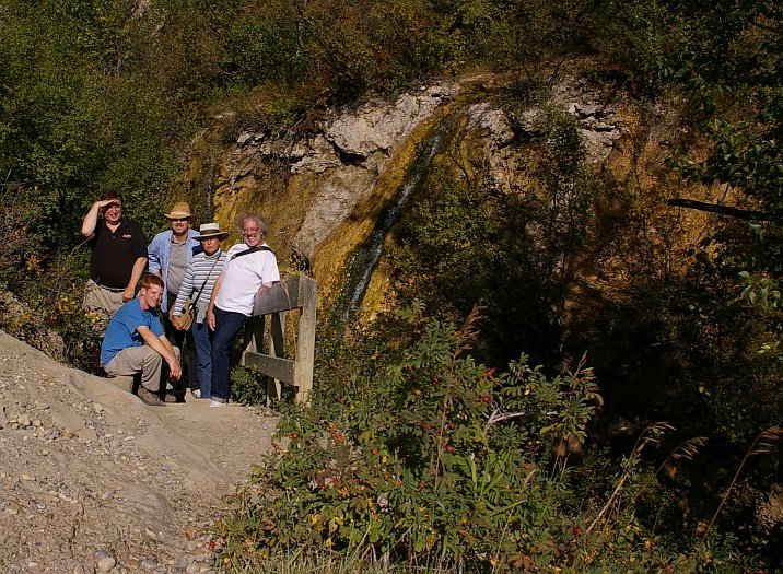 The last day of August was warm and sunny; a fine day for a walk to see the famous silver springs after which the calgary neighborhood was named. After a refreshing java and a chinwag at an outside table at Cafe Le Matin we headed off down the "infrastructure trail" the federal Liberals paid for following a by-gone election and ended up at the river's edge where the springwater cascades down the steep side of the gully. Special guest Dan Krysak carried The Mayor's tripod (without which this photo would not have been possible) and Big Walt, in a rare outburst, declared that the $50,000 the "infrastructure trail" cost had been money well spent. |