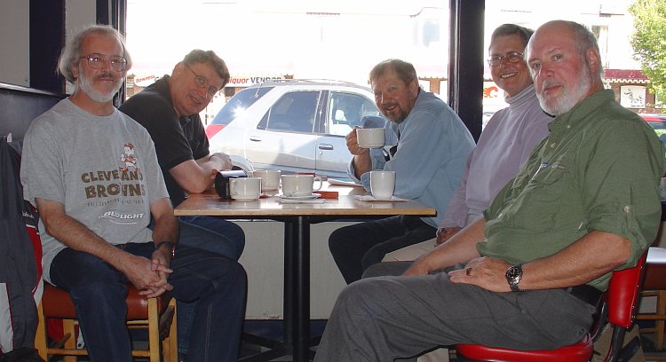 The first day of autumn at Cadence Coffee in Bowness. Bob brought along the wooden winding key for his latest wooden clock project. It's a really neat-looking thing and if The Mayor had half a brain in his head he would have asked Bob to hold it up for the photo. There's a wee bit of it visible peeking out from behind the middle coffee cup. Bob's promised a few pics when it's done, so stay tuned for that. Bob also mentioned a guy who makes animated wooden sculptures. You can take a look at them here. |