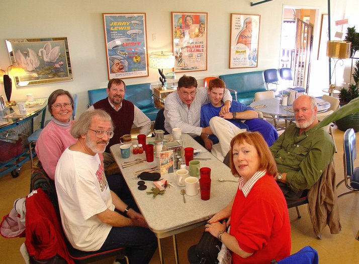Ginger got the day off from school because of the Telus strike so she joined us for a bowl of pumpkin ice cream and a java. No explanation for the presence of Dan Krysak (hizzoner will refrain from suggesting that he might have been playing hooky). This one was billed as a "Bring Your Science Project Klatsch" mostly because The Mayor was planning to bring his science project which you can see on the table in front of him. It's a potato which decided to grow leafy tendrils and stay alive for months longer than most non-alien earth potatoes. Hizzoner's shrivelled spud seemed to gross out the waitress but she kept our cups full just the same, so no harm done.