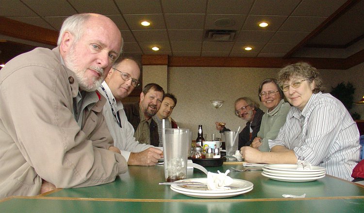 Dan, Dan, The Macheesmo Man instigated this foray to the Pizza Hut in Brentwood (that's him way in the back on the left) for a lunch-time Klatsch and we even coaxed out a coupla workin' stiffs from the TECH in the esteemed personages of Digby and Sheil. Bob had been wondering about the ethics of patronizing a large American-owned chain like Pizza Hut after we'd blathered on about how we only go to independent coffee shops -- yadda, yadda, woof, woof -- and Lawrence and Mary came to The Mayor's rescue by pointing out that the Pizza Hut tradition goes back to the pre-Klatsch days when none us had any ethics. Mary even used the term "grandfathered in" which Hizzoner appreciated. It's a term you don't hear enuff, sez he. |