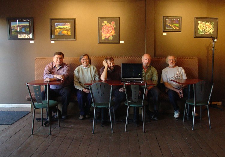 Here we are at Central Blends, plugging local artists on the InterWeb again. Not sure who did the paintings on the wall behind us, but they're quite nice. Bob brought his new Toshiba laptop computer in to show us how it can pick up TV. That little black square on the table is it. It had a really great video of ancient Egypt playing on it but, as luck would have it, the moment the shutter chose to click, the screen was showing nothing but black. Sheesh. Technology. |