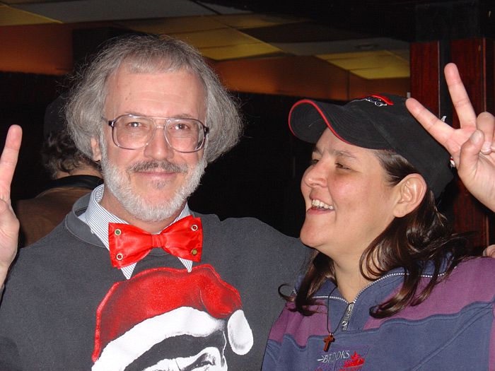 In all our years of Klatsching (which is about three now, I think) we're never been serenaded before. But hey, there's a first time for everything. A lady named Patricia stopped by our table and sang us a song in what she termed "a mixture of aboriginal languages". Needless to say, none of us could understand it, but it was lovely to hear just the same. When Hizzoner piped up and asked Patricia if he could take her picture, she agreed on the condition that he be in it as well. George did the honours and here we are. |