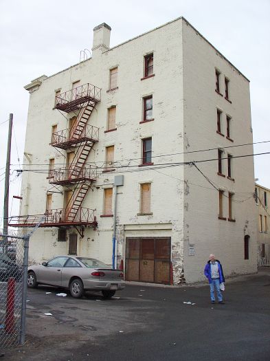 On our way back to the car, George posed for this shot by one of Calgary's forlorn but not yet forgotten landmarks. It's the back end of the King Edward Hotel and it's the back end of 2005. Merry Christmas and Happy New Year, everybody. See you in 2006! |