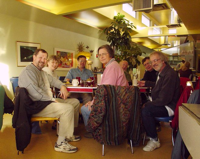 A warm and sunny start to the New Year at Diner DeLuxe. Both Sheila and Gerry Donaldson are still at large in the community, so they stopped by to join us for a late lunch. Gerry declared Diner DeLuxe's lamb the best he had eaten outside of New Zealand. Sorry to the folks who don't show up that well in the shot. I recall Ansel Adams saying to me many years ago as we hiked through Yosemite: "The more old farts you try to cram into the frame, the tougher it gets. That's just way it is, bub." He knew a thing or two, Ansel. |