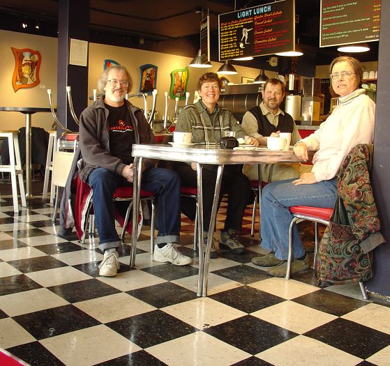 What's wrong with this picture? PVS is not in it. While we were yucking it up at Cadence Coffee in beautiful downtown Bowness, he was chipping away at a chunk of mold in his bathroom at home. Could be the proprietor of Cadence figured we should've been somewhere else, too. He seemed to be dropping subtle hints (like mopping the floor around us and noisily counting the change in the cash register) that he'd be able to close up for the day if a certain party of four would get the heck out of his shop. We eventually did, but not until we were darn good and ready, darn it! |