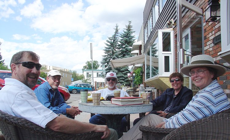 August 2nd and it's just been a great summer. People are droppin' dead all over the world either from bombs and lead poisoning in the Middle East (what else is new) or the heat everywhere else -- but not here. The outside tables at the Lazy Loaf and Kettle used to get a bit toasty on a sunny day but they installed electric awnings that you can let down to provide a bit of shade and they work great. Topics of conversation ranged from the scandalous state of out-of-province health insurance for travellers to ING Direct's new on-line security to Nazi tactics during WWII. Whew. |