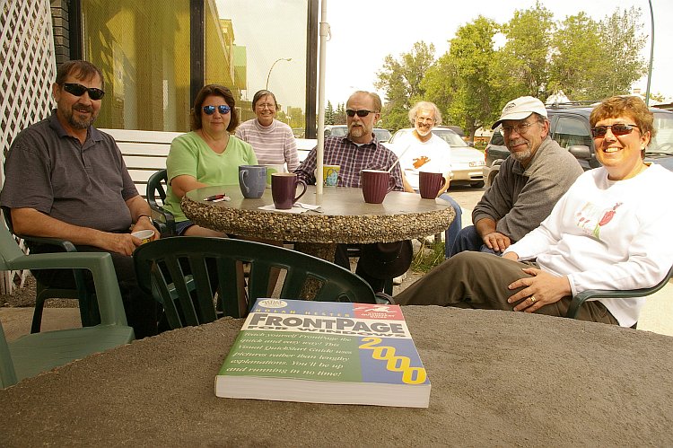 A lovely summer's day outside at Central Blends in Hillhurst. Hizzoner is gettin' back into the Bookcrossing thing, the better to clean his basement of no-longer-needed tomes of one sort or another. Here's a copy of a FrontPage 2000 manual which is beginning its journey to a new home. |