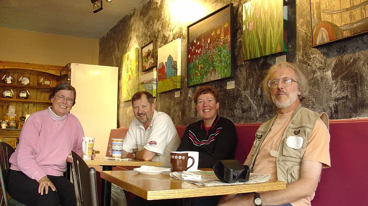 This may well mark the first time a customer -- unrelated to either Blends Roasterie on Edmonton Trail N.E. or Central Blends on 19th Street N.W. -- has purchased a coffee at both establishments within a span of 60 minutes on the same day. You might think: "Only an idiot would do such a thing!" And you'd be right. The idiot in question (seen here on the right) told everyone to come to Central Blends and then went to Blends Roasterie. Realizing that he, himself and him were quite alone with themselves at the java joint on Edmonton Trail, he climbed back in his small red car and headed for Central Blends where the rest of the Klatschers were waiting. Mary, taking pity on the pathetic old loser, bought him this nice chocolatey treat...