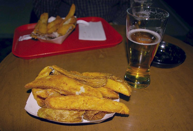 Hizzoner's lunch: a paper basket of chicken 'n' chips and a glass o' Canadian -- from a jug, as God intended.