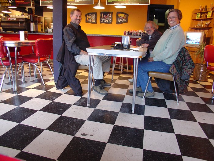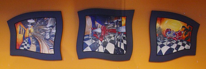 Just three pawns on the chess board of life, that's us. And that's Cadence Coffee we're both inside of and in front of simultaneously, at the same time. This, you may remember, is one of the venues where the bendy painting guy flogs his wares and if you look on the wall at the back, Cadence has a triptych of itself displayed on a bit of itself. It's all very postmodern and bauhaus and brouhaha. Here's a closer look at the bendy artwork... |