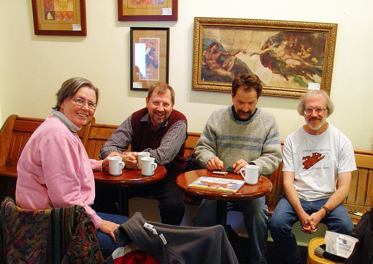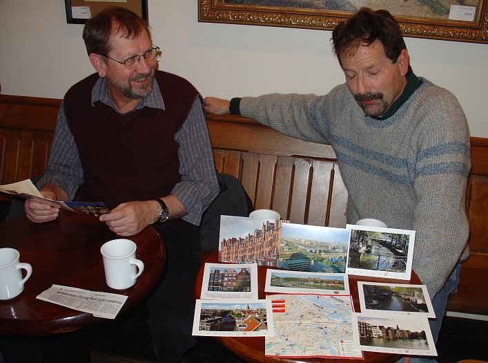 A cozy and warm Klatsch at the Heartland Cafe; chilly outside but very warm inside. Herr Doktor Terry Smith paid a return visit and brought a little bit of Amsterdam with him. The small plastic envelope you can see on the chair in the lower right-hand corner of the the pic contains a selection of post-cards he collected while in the famous Dutch city. It's tough to see them in the envelope, so here's what they look like all spread out...