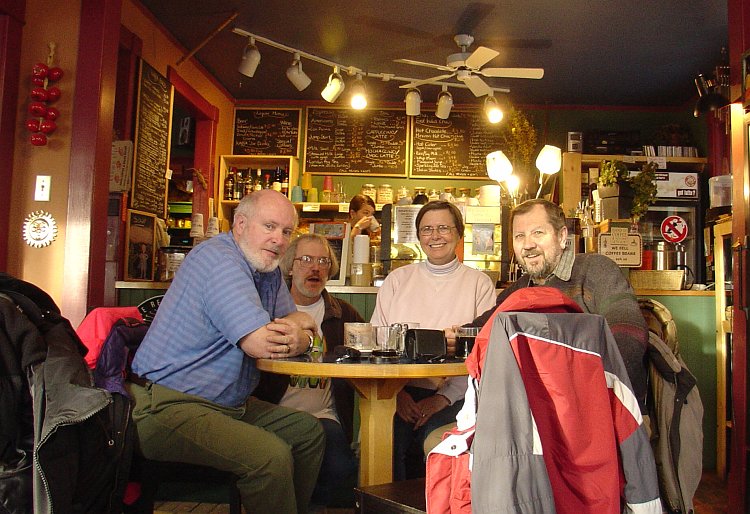 Winter decided to pay a brief visit on this 10th day of January in what has been (once again) a very mild winter. Nevertheless four hardy souls found their way down to the Kaffa Coffee House in Marda Loop for a cuppa and a chinwag. The photographer left his jacket right in the foreground so it would be sure to be seen. What an idiot (he is old and is losing his mind). This was Mr. T's last appearance for a while. Next week he's going on a dog sled adventure and after that back down to the Dominican Republic. If there are dog sled pics available we will post a few here (hint, hint). Hey, wait a minute! What are those glowing antennae sticking out of Lawrence's head? Could it be he's really an alien robot from the future scanning the area for parkerhouse rolls? Only time will tell. |