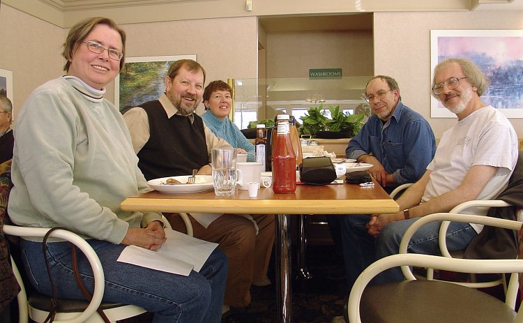 Pancake Day +1, 2007 Edition. A rather windy, chilly day outside, but toasty warm inside Dr. Tongue's 3-D House of Pancakes in Calgary's notorious Motel Village (of the Damned). Breaking news was that the Von Steins are forsaking Microsoft and going over to the Mac. Good for them, say I. The thorny issue of whether kids should wear helmets while tobogganing was raised but was not successfully resolved. Carnage on the slopes will continue, I guess. |
