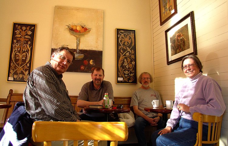 Nice light always comes through the windows at the Heartland Cafe if it's sunny outside. As is our custom, the art works on display in our corner of the cafe are included in the shot. The one in the forground is Back of Chair in Three Dimensions: a study in obstruction. The photographer would have moved it but he is old and he is losing his mind. |