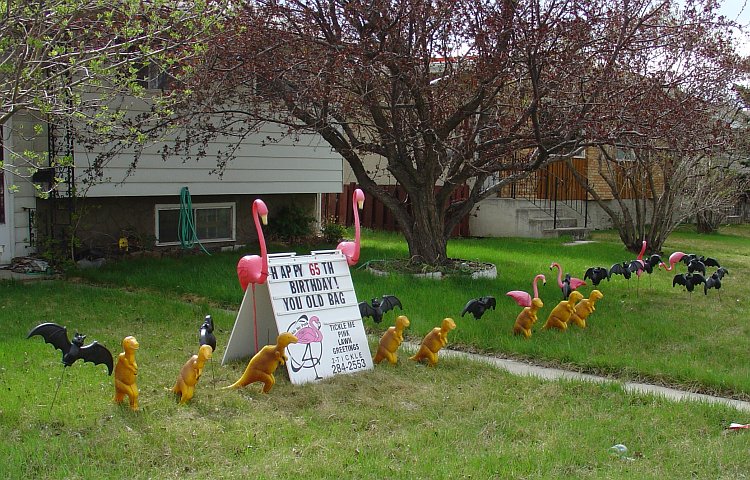 O.K., not the best photo the KlatschMeister has ever snapped. Moving on. Welcome back to cowtown Lawrence and Mary. Soundz like they had a good time in B.C. Big Walt's better half has lowered the boom on bottled water. All that plastic is bad for the land fills so too bad for you! Mr. T then brought up the subject of banning plastic bags, something which turned up on the news tonight. And, speaking of bags, the KlatschMeister passed this house on the way home and thought he'd stop for a pic...