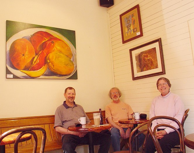 Another fine art show at the Heartland Cafe. A very warm day, too. After the snap we moved around the corner to take advantage of the cooling breeze from Heartland's fan. This photo depicts Lawrence pre eye operation. This caption is being written two days later, post eye operation and he reports that everything went very well.